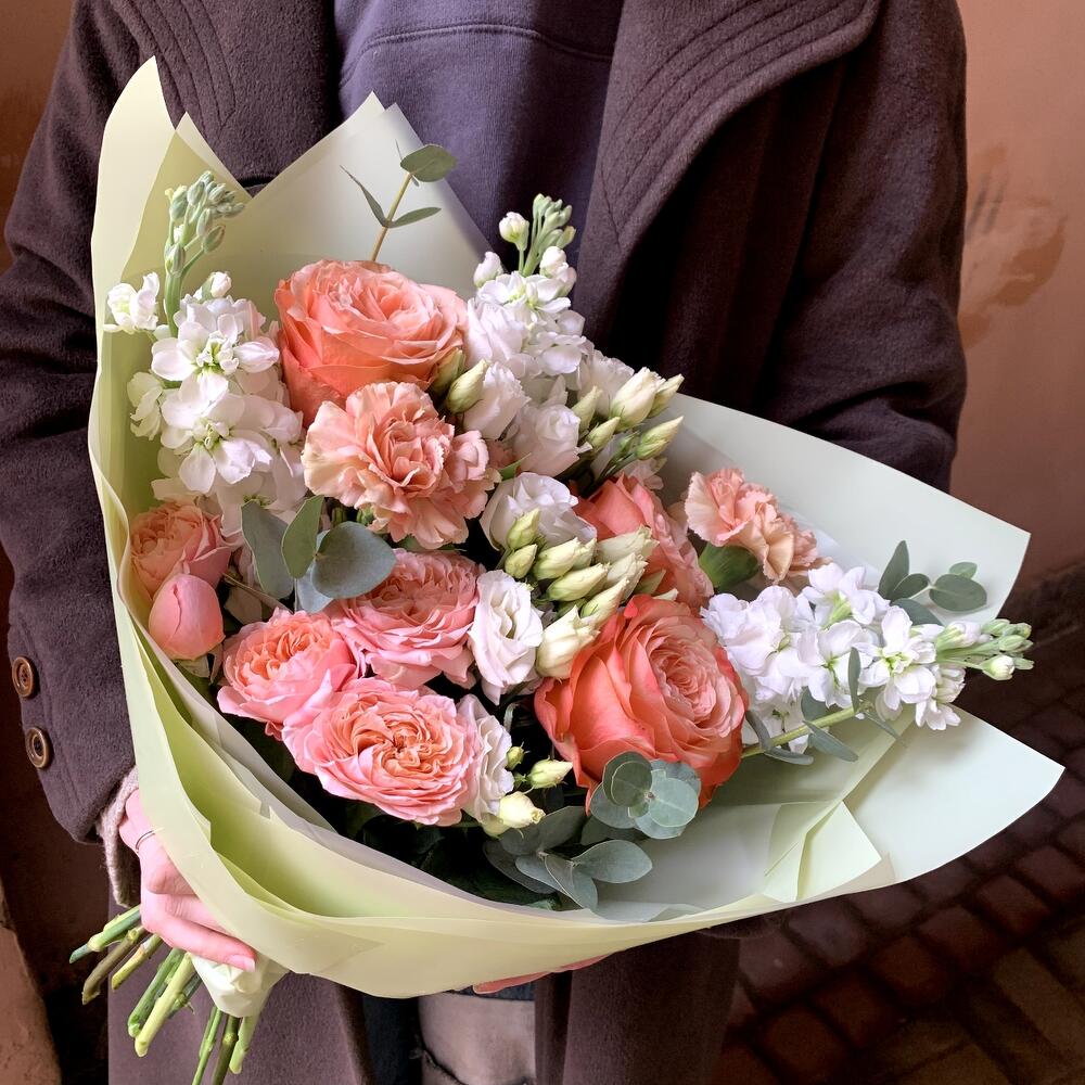 Маттиола – 3 шт.Эвкалипт – 1 шт.Лизиантус белый – 2 шт.Рускус сочи – 5 шт.Гвоздика карамель – 3 шт.Роза кахала – 3 шт.Роза кустовая пионовидная джульетта – 1 шт.Авторская упаковка – 1 шт.